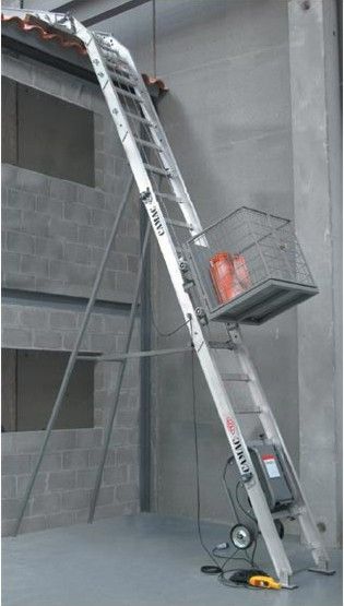Marca: Montacargas de escalera Camac Modelo: Escalera Carga máxima: 200 Kg. Velocidad de elevación: 22 m./minuto Potencia motor: 2 CV. Tensión: 220 V. Diámetro del cable: 5 mm. Lonjitud maxima en vertical: 40 m.